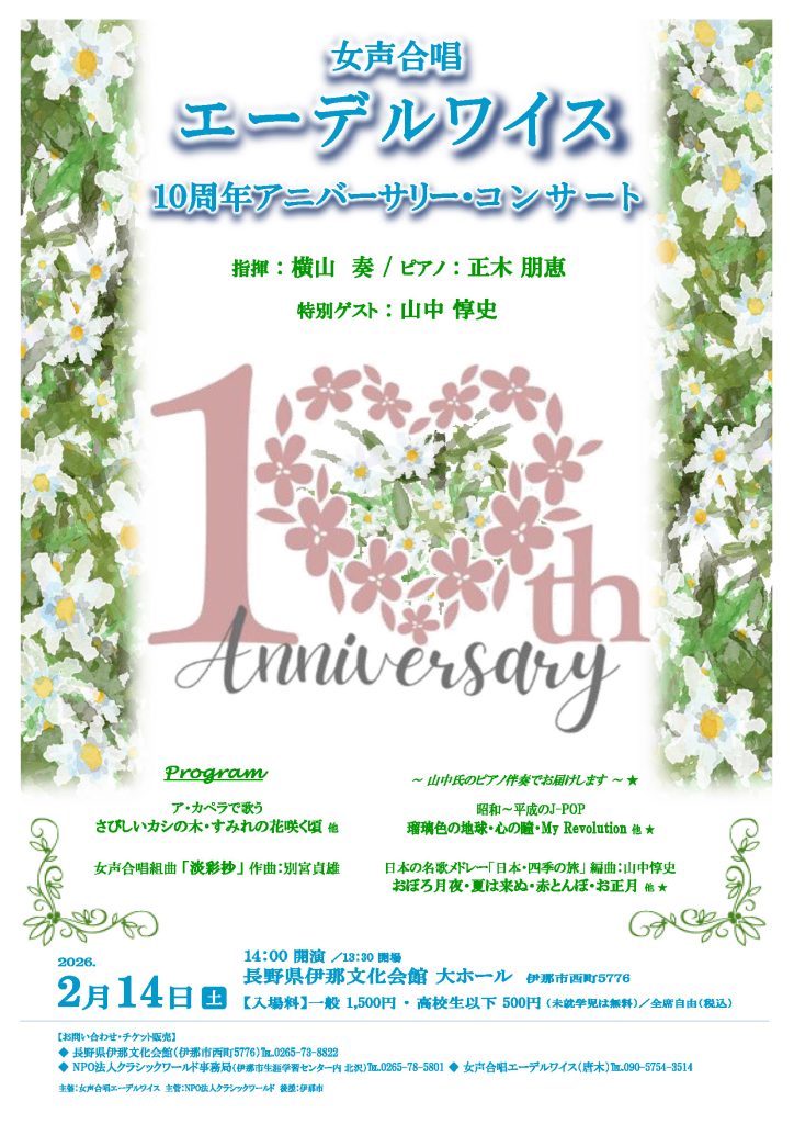 [2026.2.14:開催予定]女声合唱エーデルワイス 「10周年アニバーサリー・コンサート」