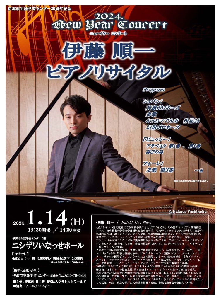 1月14日(日)に予定していた「2024 New Year Concert 伊藤順一 ピアノリサイタル」は「能登半島地震 復興支援コンサート」に変更し 3月9日(土)に延期開催いたします。